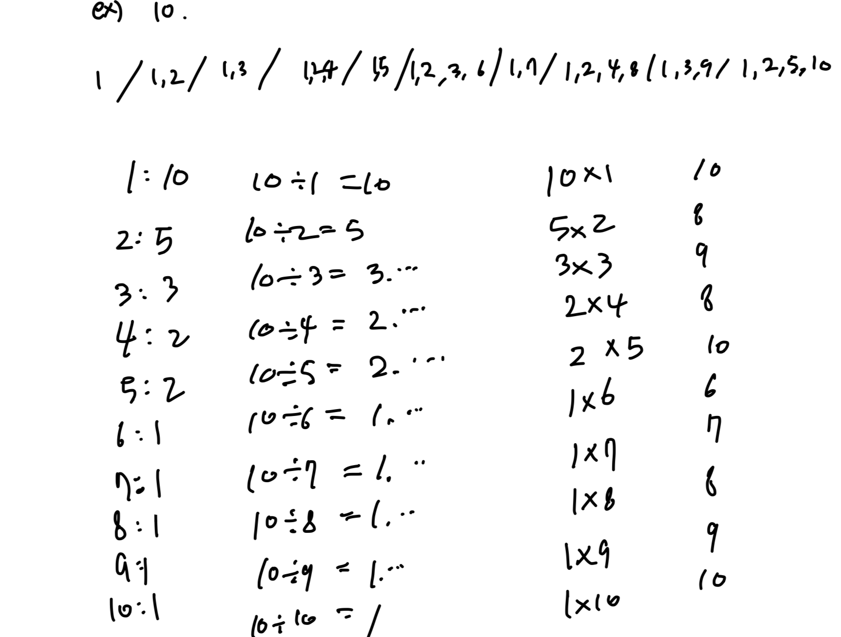 10을 예시로 모든 약수를 적었더니, n / 1 의 나머지 뺀 값이 같아서 아래와 같이 도출하였다.