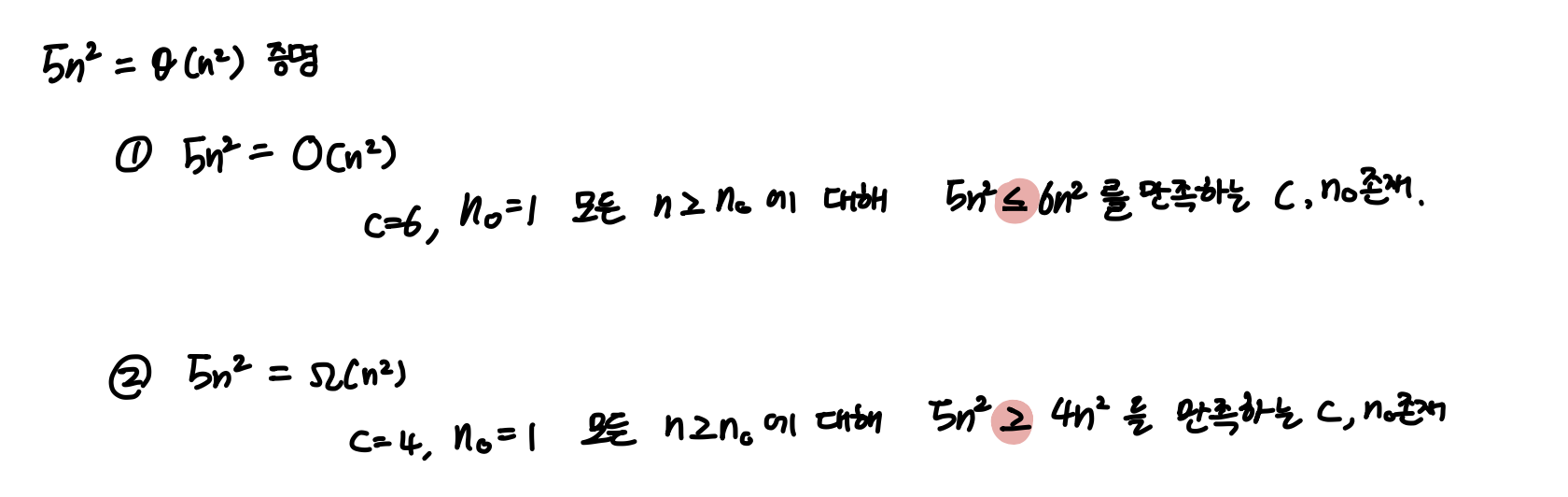 아래는 5n^2 = Θ(n^2)에 대한 증명이다. Θ의 경우, O와 Ω를 모두 증명해야하기 때문에 예시로 가져왔다.