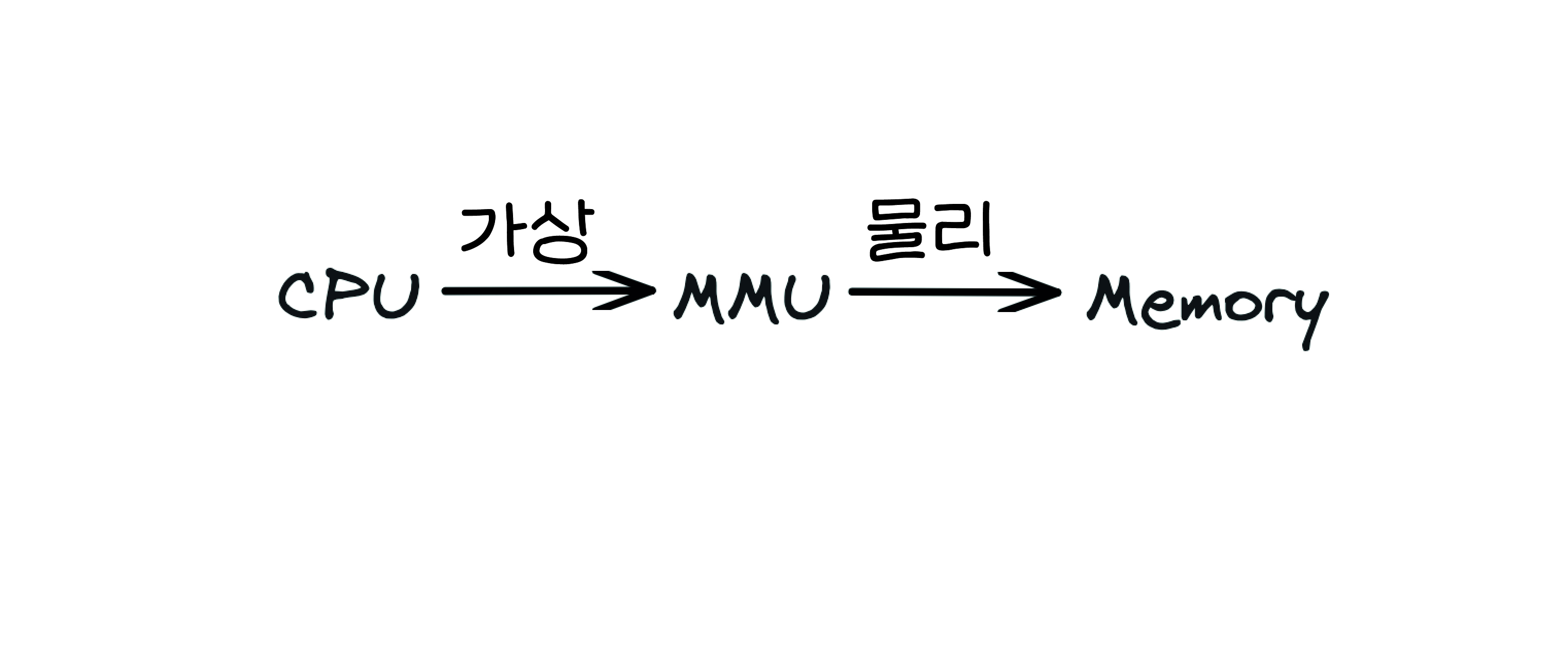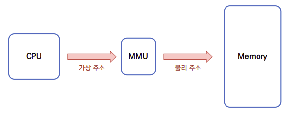 이때 중간에 위치한 MMU는 Memory Management Unit으로, 가상주소를 물리주소로 변환한다.