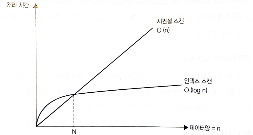일반적으로 인덱스는 스캔하는 모집합 레코드 수에서 선택되는 레코드 수가 적다면 테이블 풀 스캔보다 빠르게 접근을 수행. -> 풀 스캔이 모집합의 데이터양에 비례해서 처리 비용이 늘어나는 것에 반해 인덱스를 사용할 때 활용되는 B-tree가 모집합의 데이터양에 따라 대수 함수적으로 처리 비용이 늘어나기 떄문.