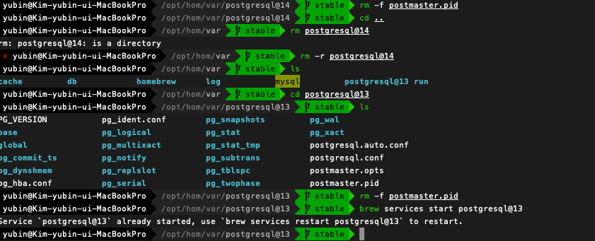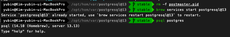 cd /opt/homebrew/var/postgresql // 특정 버전에 맞춰 경로접근 rm -f postmaster.pid // pid 삭제 brew services start postgresql@14 // 특정 버전에 맞춰 재실행 psql postgres // 실행 확인 homebrew 로 설치했습니다 에러 발생