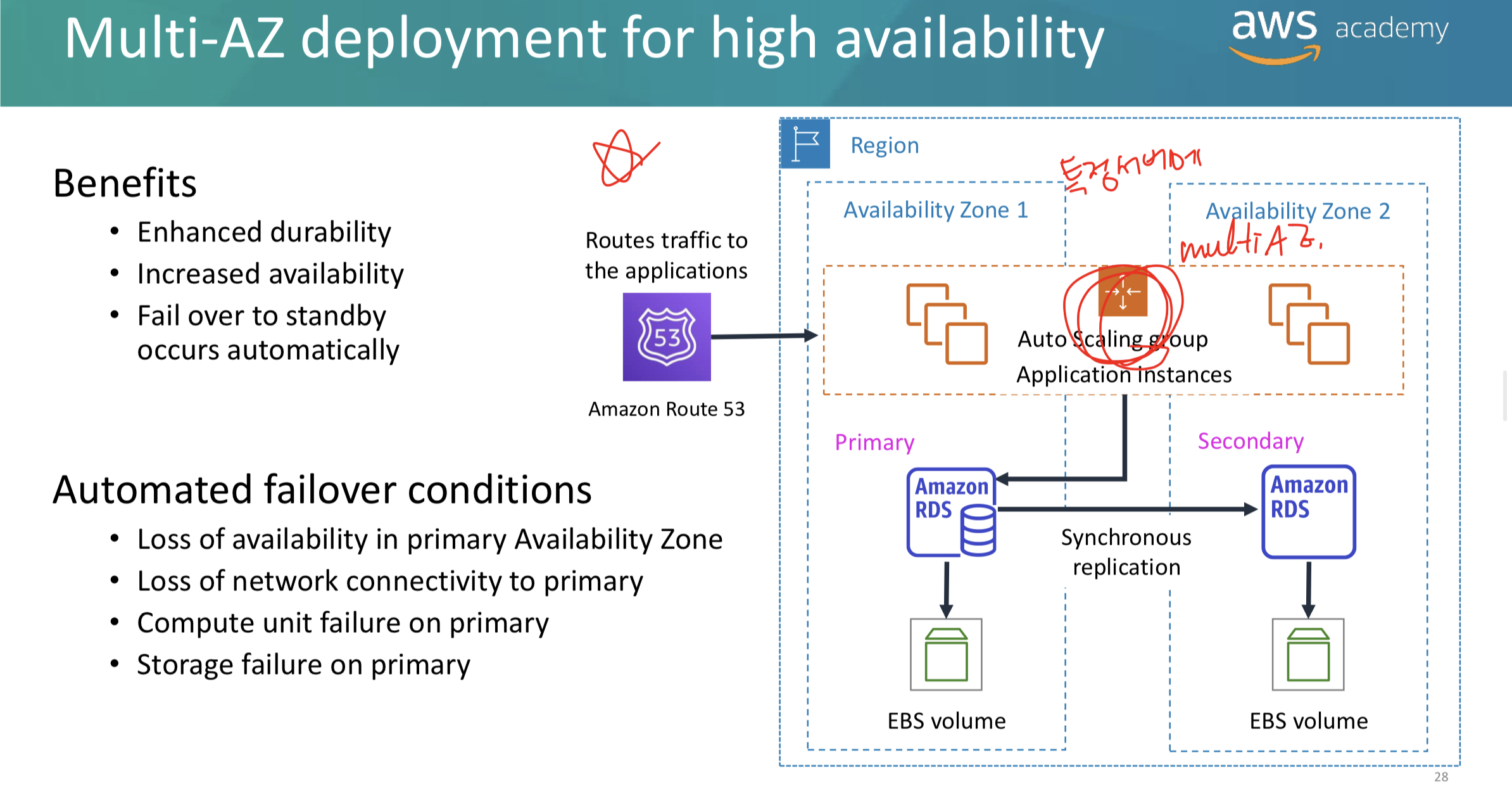 - RDS는 다중 AZ 배포(Multi-AZ deployments)를 통해