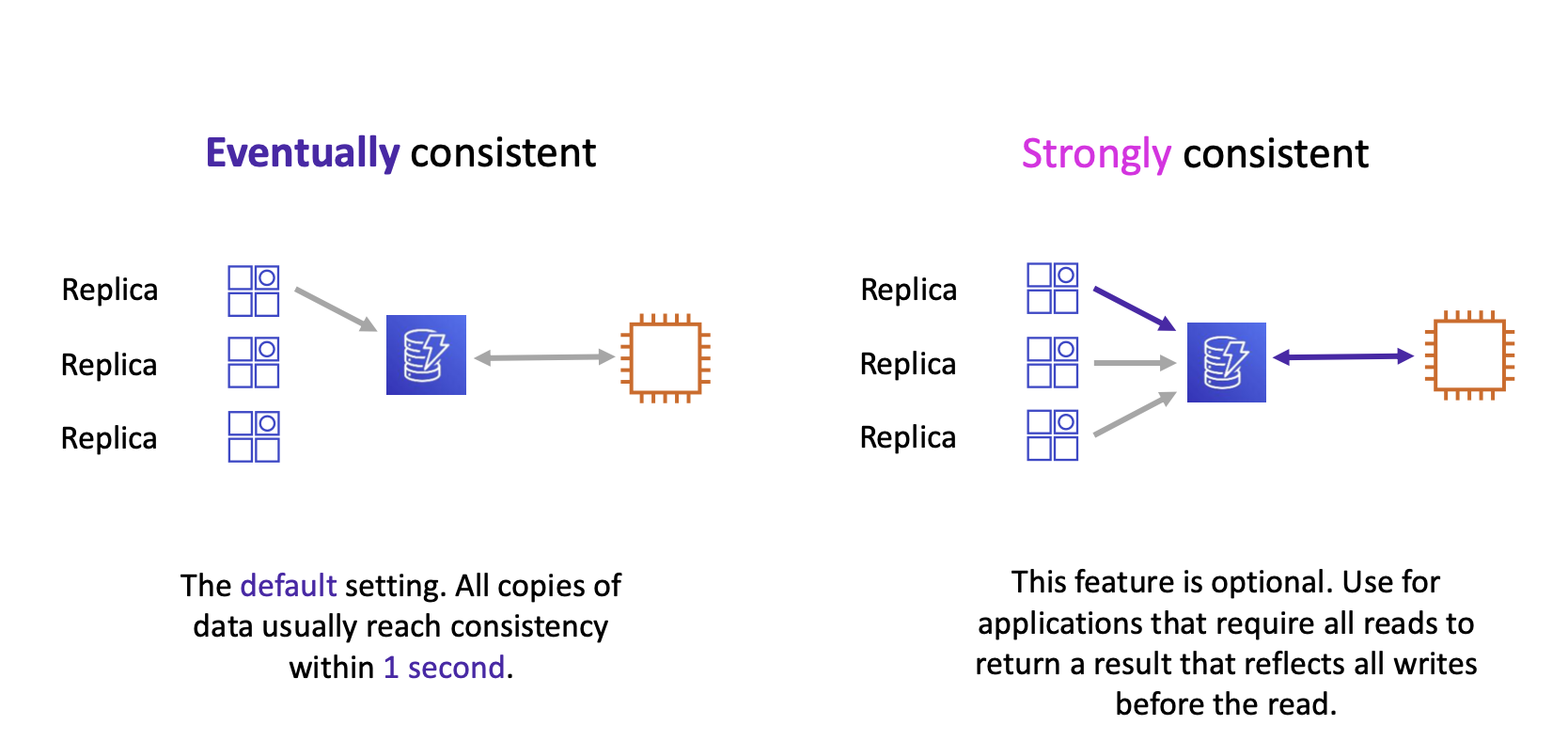 - DynamoDB는 기본적으로 이벤트 일관성을 제공합니다(일반적으로 쓰기 후 1초 후에 읽기에 대해 완전히 일관성 있음). 강력한 일관성 또한 옵션입니다.