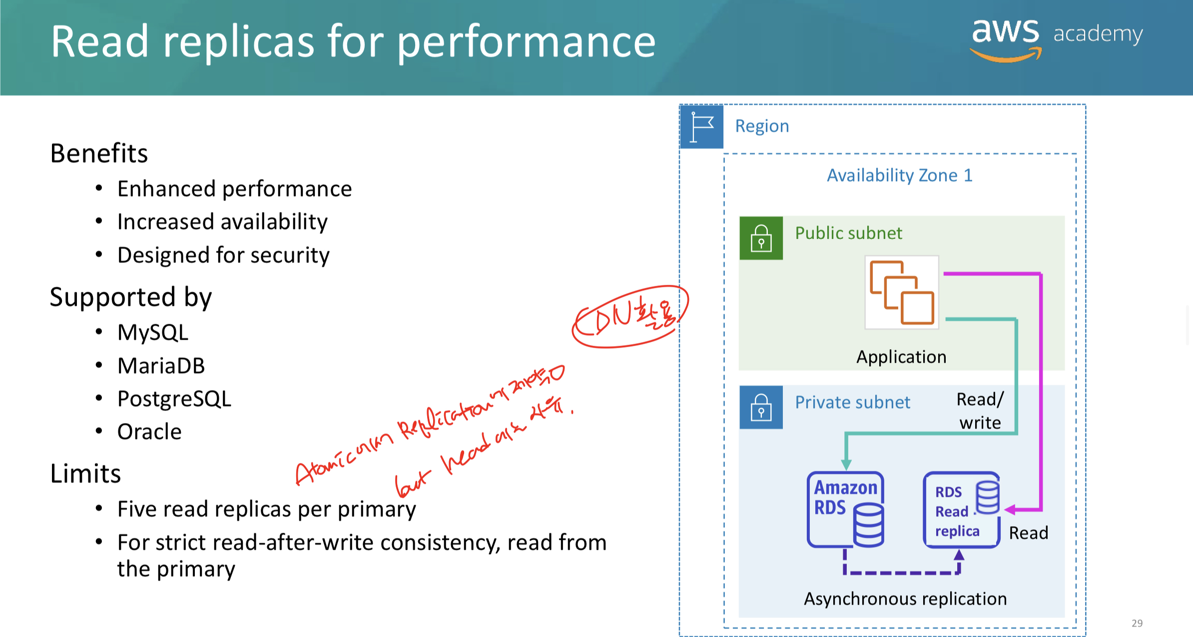 애플리케이션의 읽기 트래픽을 분산하기 위한 용도- Read Replicas를 지원하는 DB 엔진 : MariaDB, Microsoft SQL Server, MySQL, Oracle, PostgreSQ