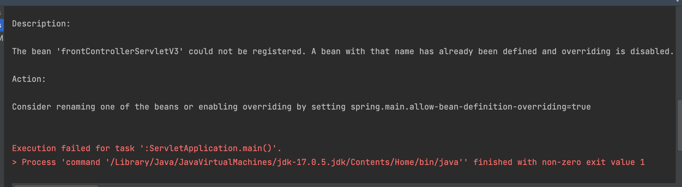 The bean 'frontControllerServletV3' could not be registered. A bean with that name has already been defined and overriding is disabled.