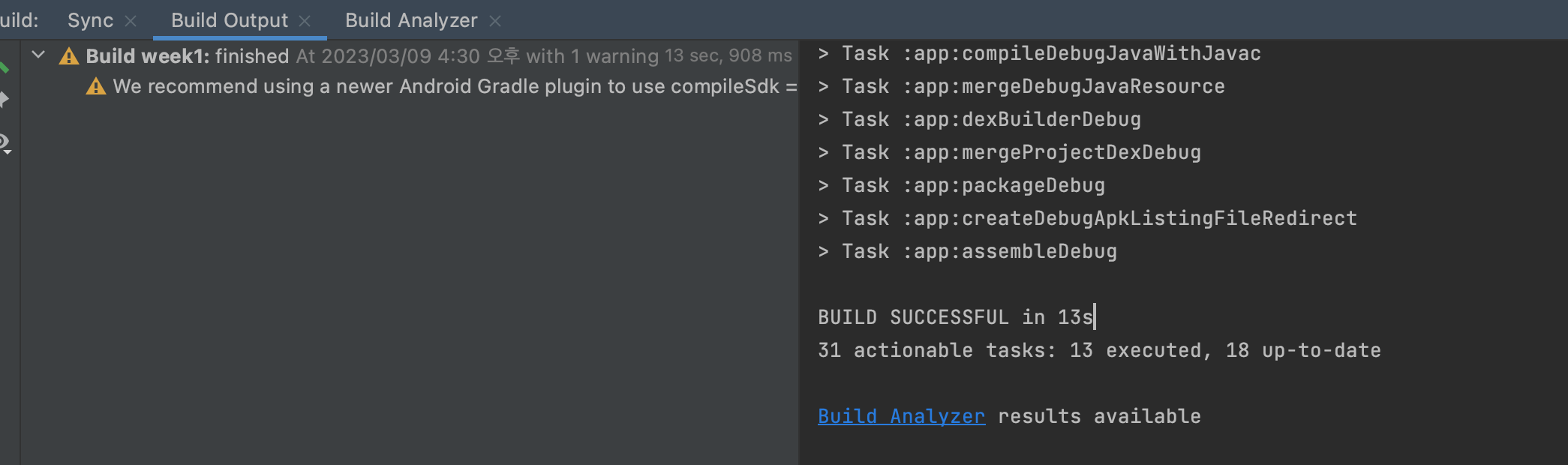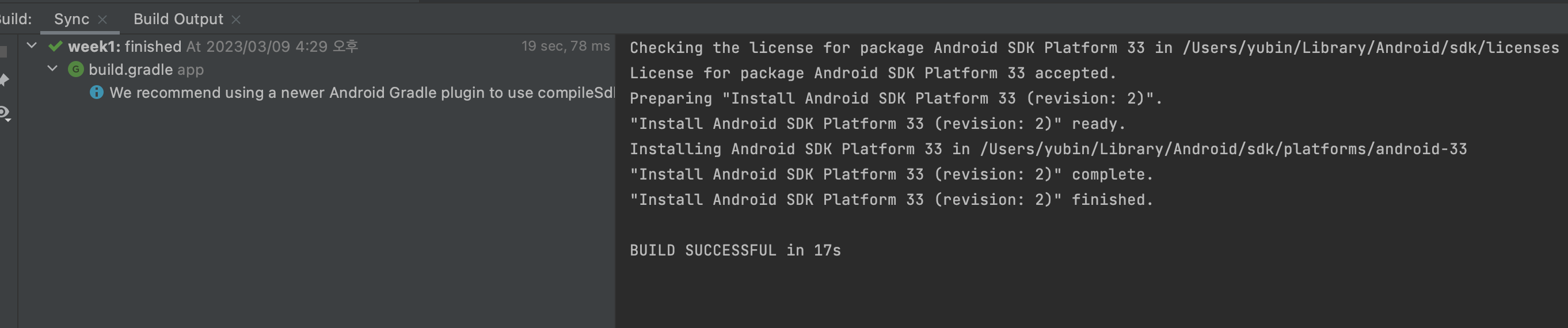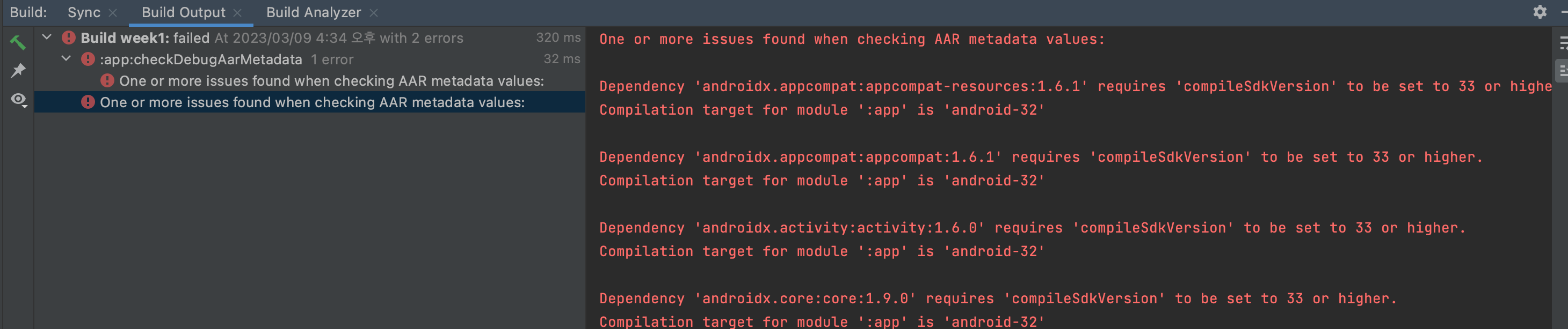 빌드시 버전 문제가 발생하였다. 그래서 gradle에서 버전을 32 -> 33으로 일부 변경하였다.
