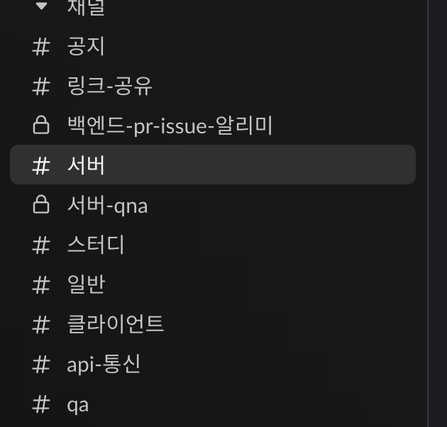 최대한 프로젝트 팀에 맞게 채널을 구성하고자 노력했고, pr issue 알리미는 서버팀 repo와 연동된 gitHub 봇을 통해 이슈 / PR 등의 사항을 즉각적으로 확인할 수 있도록 하였다.