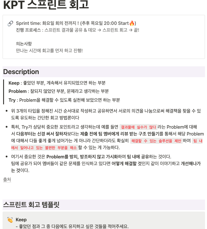 나는 세명과 함께 서버 파트를 담당하게 되어, 이쪽의 룰과 효율적인 일정관리 및 개발에 힘을 쏟고자 하였다. 그 일환으로 KPT 스프린트 회고 과정을 진행하게 되었다.