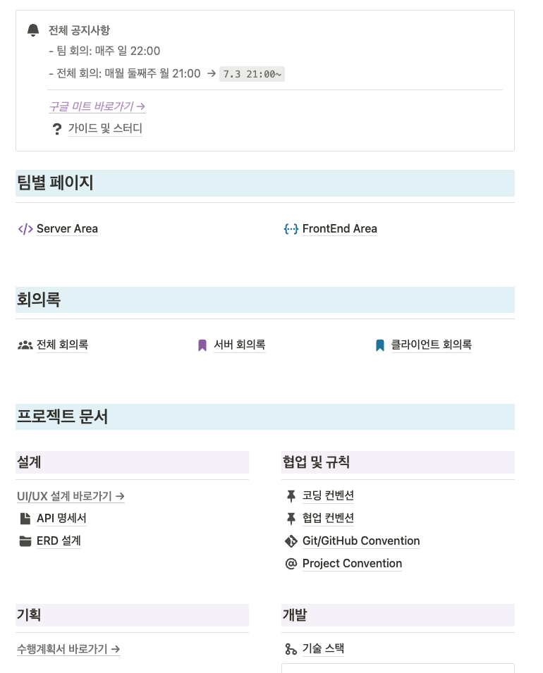가장 먼저 팀 노션을 제작했다. 기존에 진행했던 프로젝트들의 노션과 좋은 팀플을 위한 자료들을 여럿 참조하여 만들었다. 노션을 사용하지 않아본 분들도 있어서 최대한 직관적이고 깊지 않은 단계로 구성해보고자 했다.