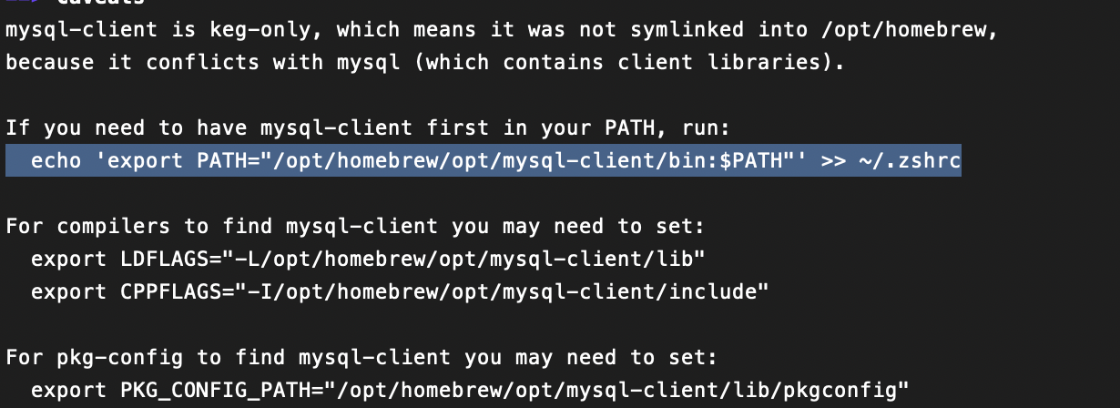 brew를 통해 다운하면 .zshrc에 path 를 저장하는 명령어를 알려준다. 이를 치면 path가 저장되면서 mysql 명령어 사용이 가능하다.