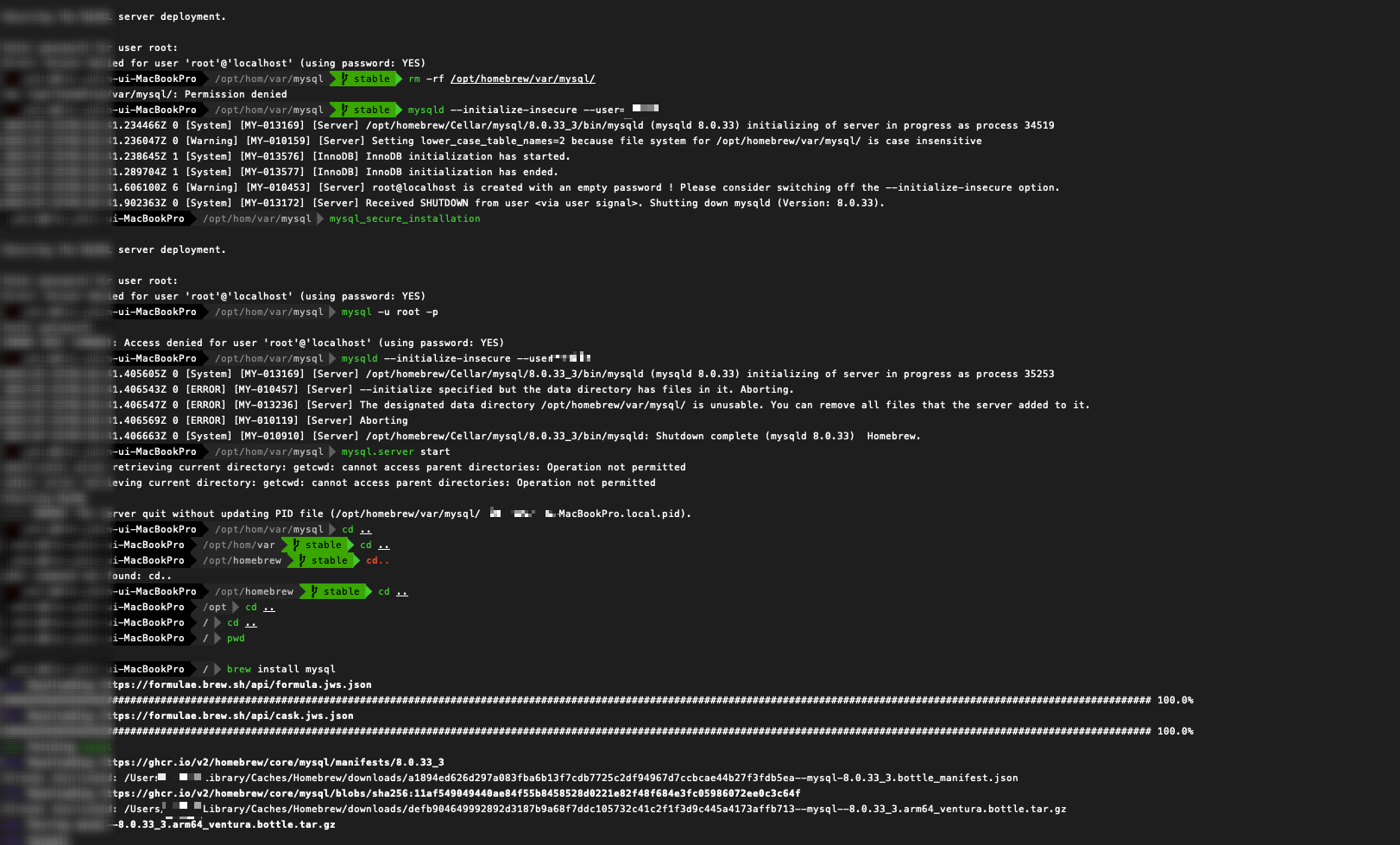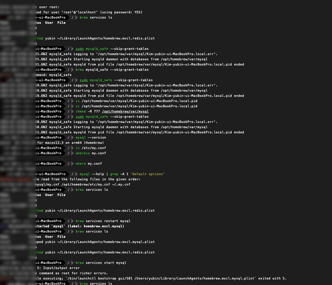 대부분의 블로그에서 지시한대로 brew 를 통해 mysql 재설치, rm -rf를 통해 모든 mysql 관련파일 삭제, ps -ef | grep mysql 으로 mysql 관련 내용 확인 후 kill 하는 등 대부분의 방법이 다 먹히지 않는 상황이었다. --skip-grant-tables이나 init 명령어를 통한 cnf 파일 재설정에도 기존 root 비번을 입력하라는 메세지나 다른 오류가 발생하는 상황이었다.