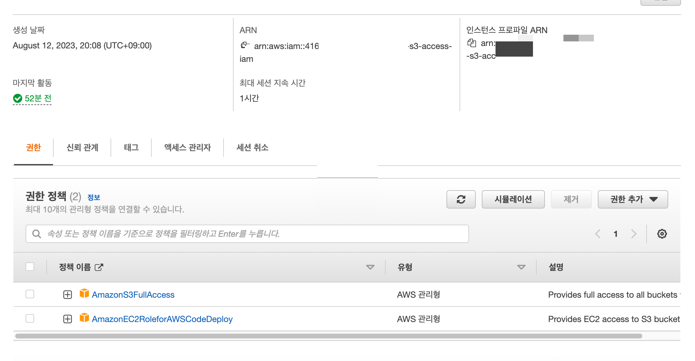 이번에는 다시 블로그들에서 IAM 권한 설정을 한 부분을 자세히 살펴보니, S3관련 설정에서 AmazonEC2RoleForAWSCodeDeploy를 추가하신 분도 있길래 따라서 추가해보았다.